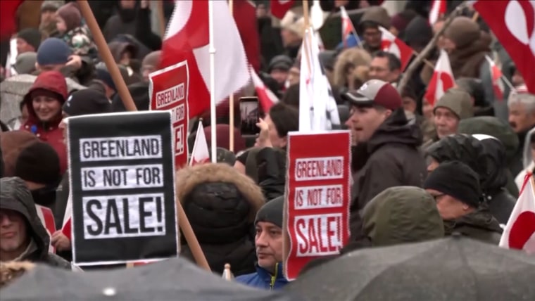 People hold Greenlandic flags and placards as they gather by the U.S. Consulate in Nuuk, Greenland, on Saturday to protest against Donald Trump and his announced intent to acquire Greenland.Sean Gallup / Getty Images
